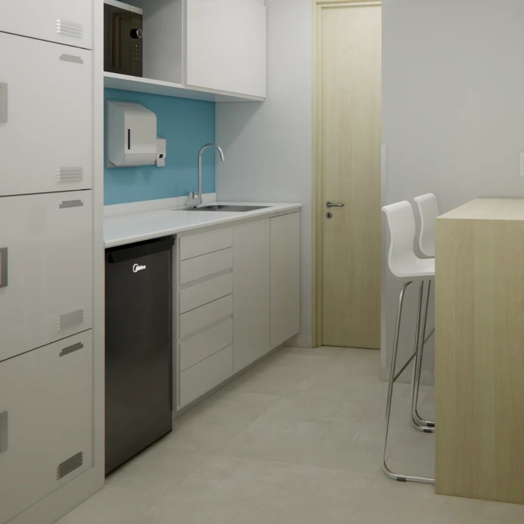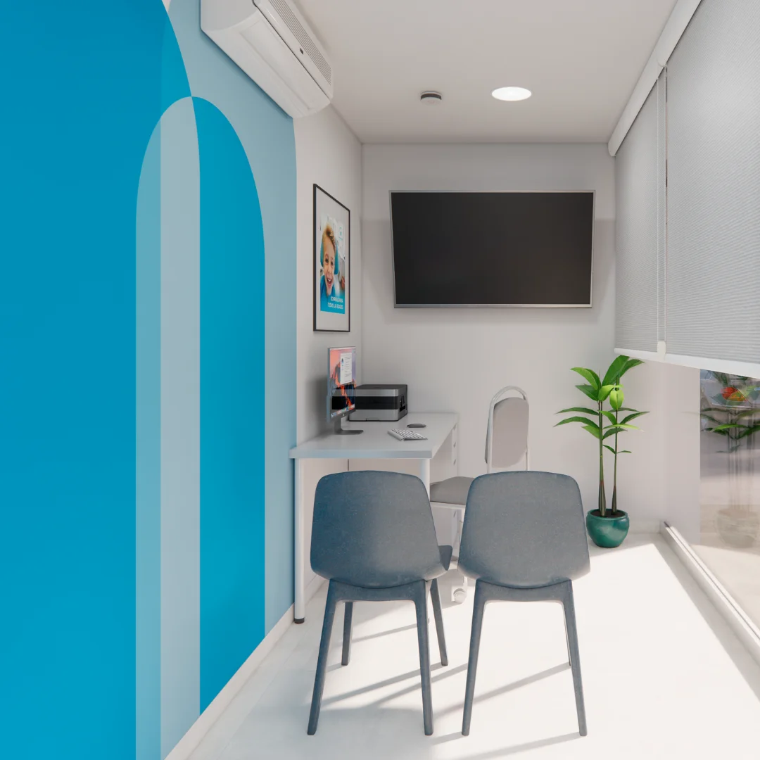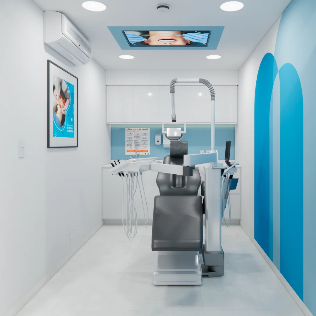 Para garantizar el servicio integral de Holbein, incorporamos a sus instalaciones tres consultorios, una oficina administrativa, descanso médico, una Central de Esterilización y Equipos (CEyE) y áreas de tomografía dental y rayos X. En cada uno de estos espacios colocamos luminarias tipo luna que irradian una intensa luz fría, diseñada para acentuar la vitalidad de su paleta de azules sandro, ágora y medalla.