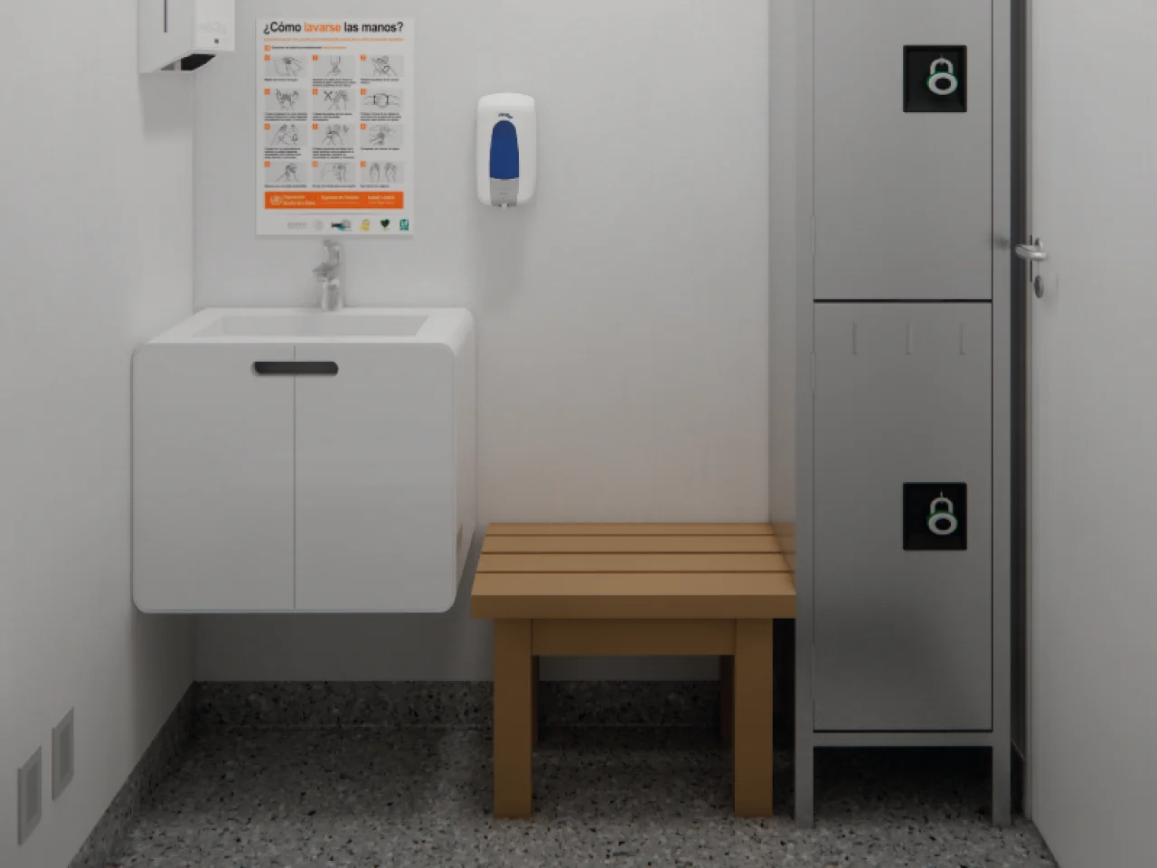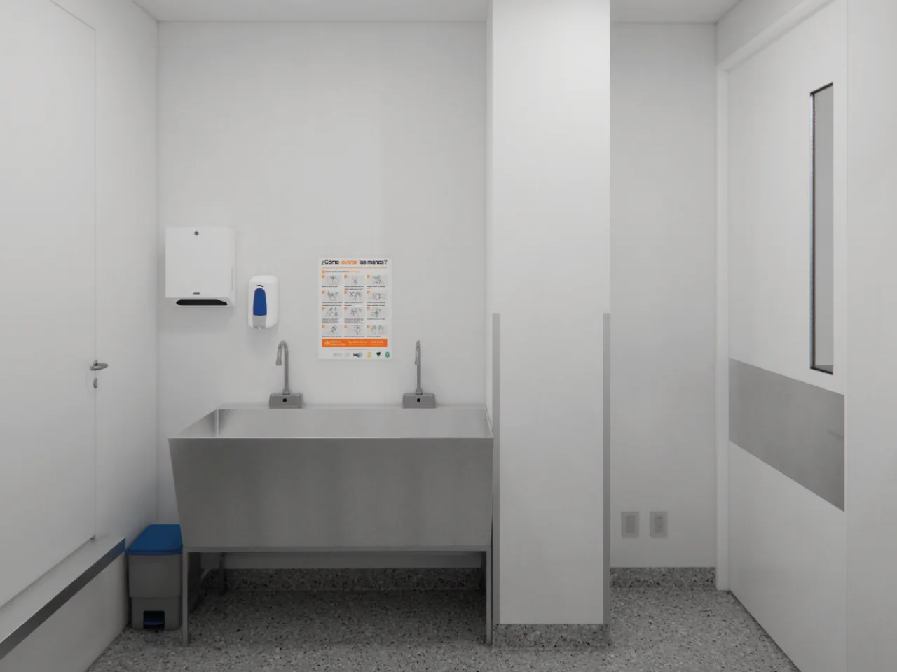 Igualmente, los muros y techos se recubrieron de pintura vinílica antibacterial, la cual es fácil de limpiar, resistente a las abrasiones y, por su bajo contenido en compuestos orgánicos volátiles (COV), crucial para asegurar la calidad del aire interior.